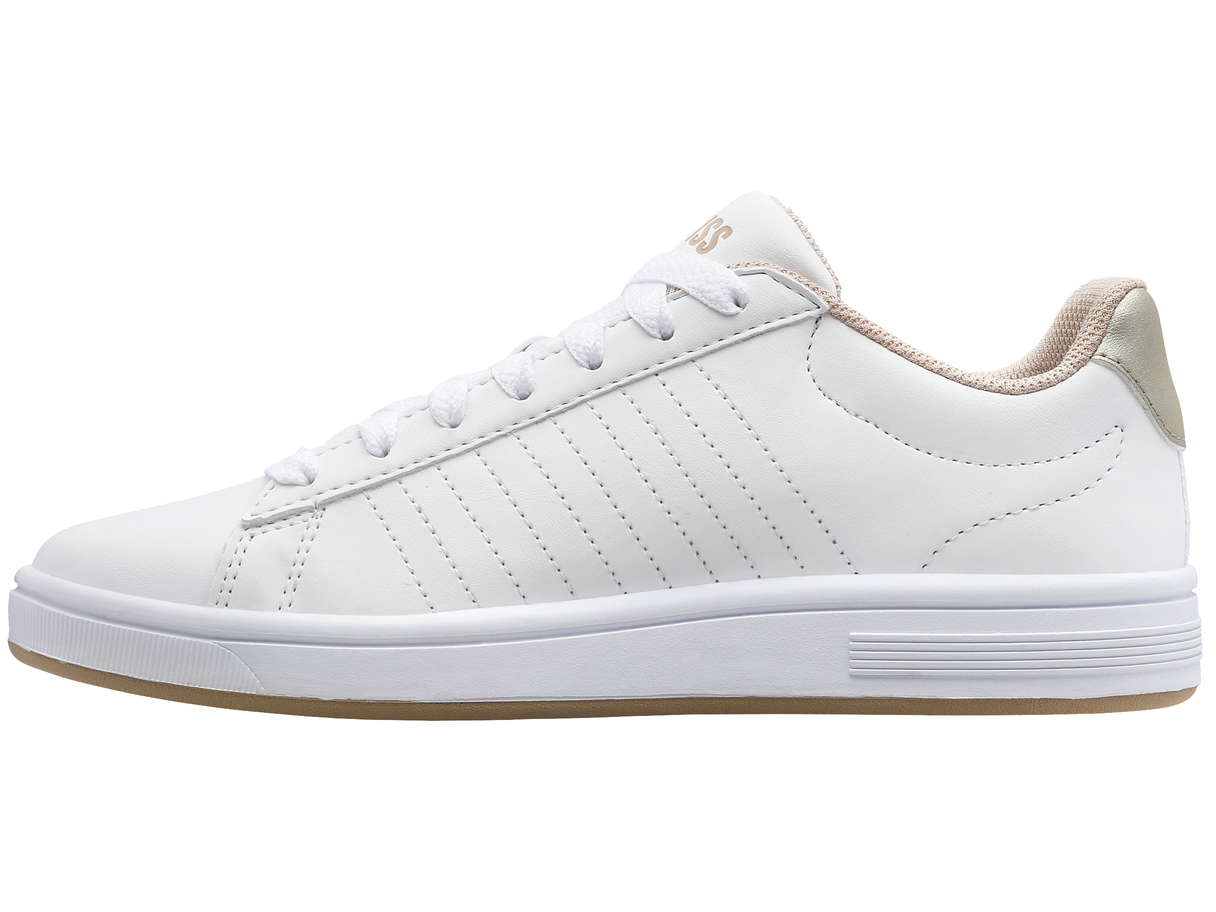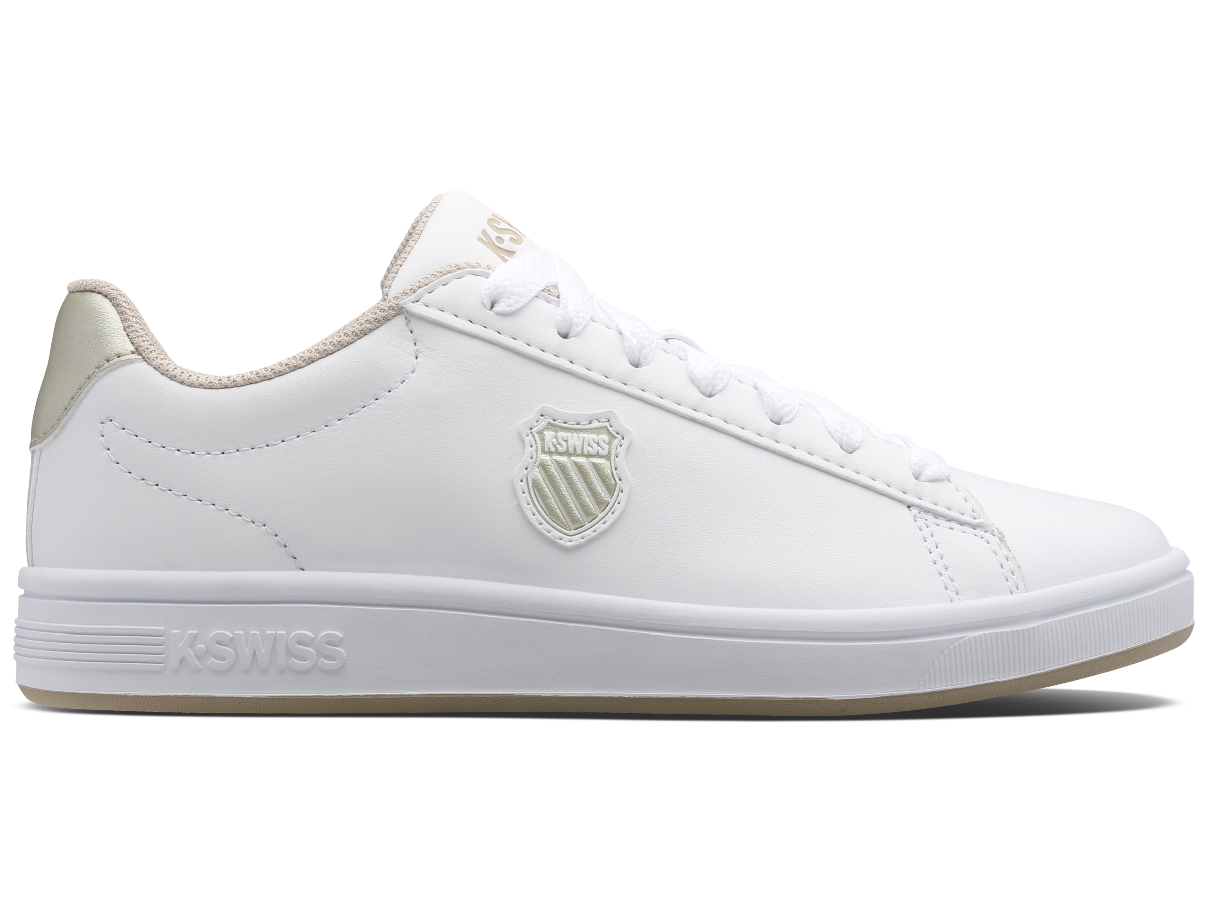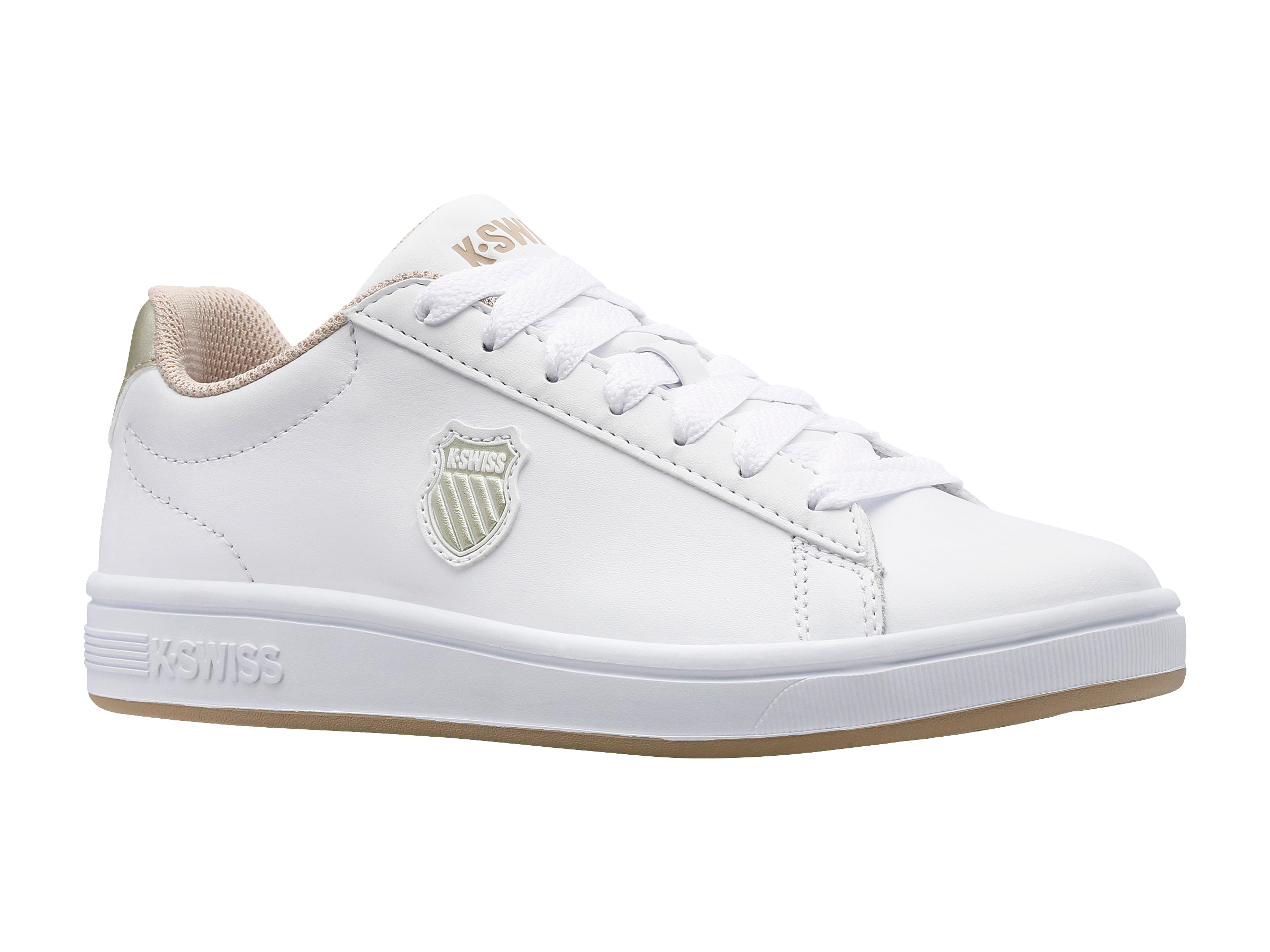 A K-Swiss classic gets a contemporary refresher with the Court Shield. Utilizing the features of the original Court Classic, this updated take offers timeless court inspiration in a versatile construction built for comfortable, everyday wear. A leather upper and modern debossed shield logo adds an elegant touch to the clean side paneling, while the deco-stitched 5-stripes augment the medial side and a nod to our classic court heritage